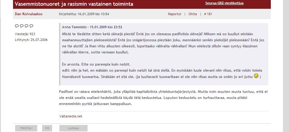 Kun eräs verkkokeskustelija varoittaa Koivulaaksoa väkivallan kierteestä, ja paheksuu väkivaltaan yllyttämistä. Koivulaakso vastaa: ”Pasifismi on vakava mielenhäiriö, joka ylläpitää kapitalistista yhteiskuntajärjestystä. Mutta noin muuten musta tuntuu, että ei ole enää omalta osaltani hedelmällistä käytä tätä keskustelua. Loputon keskustelu on turhauttavaa, musta pitäisi ennemminkin pyrkiä jatkuvaan kamppailuun.”